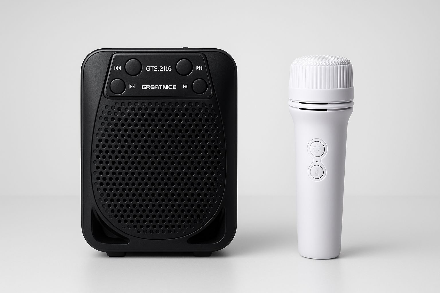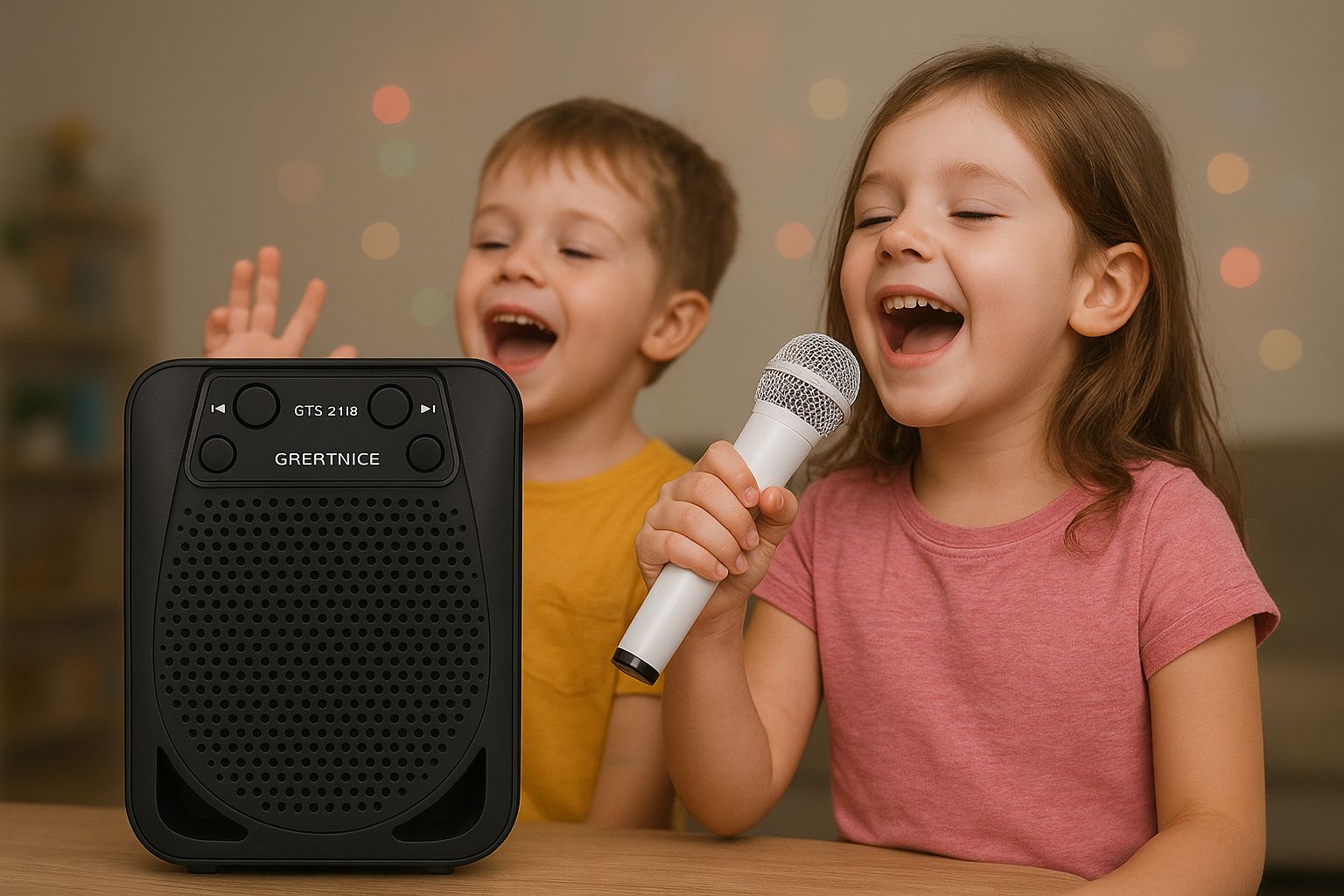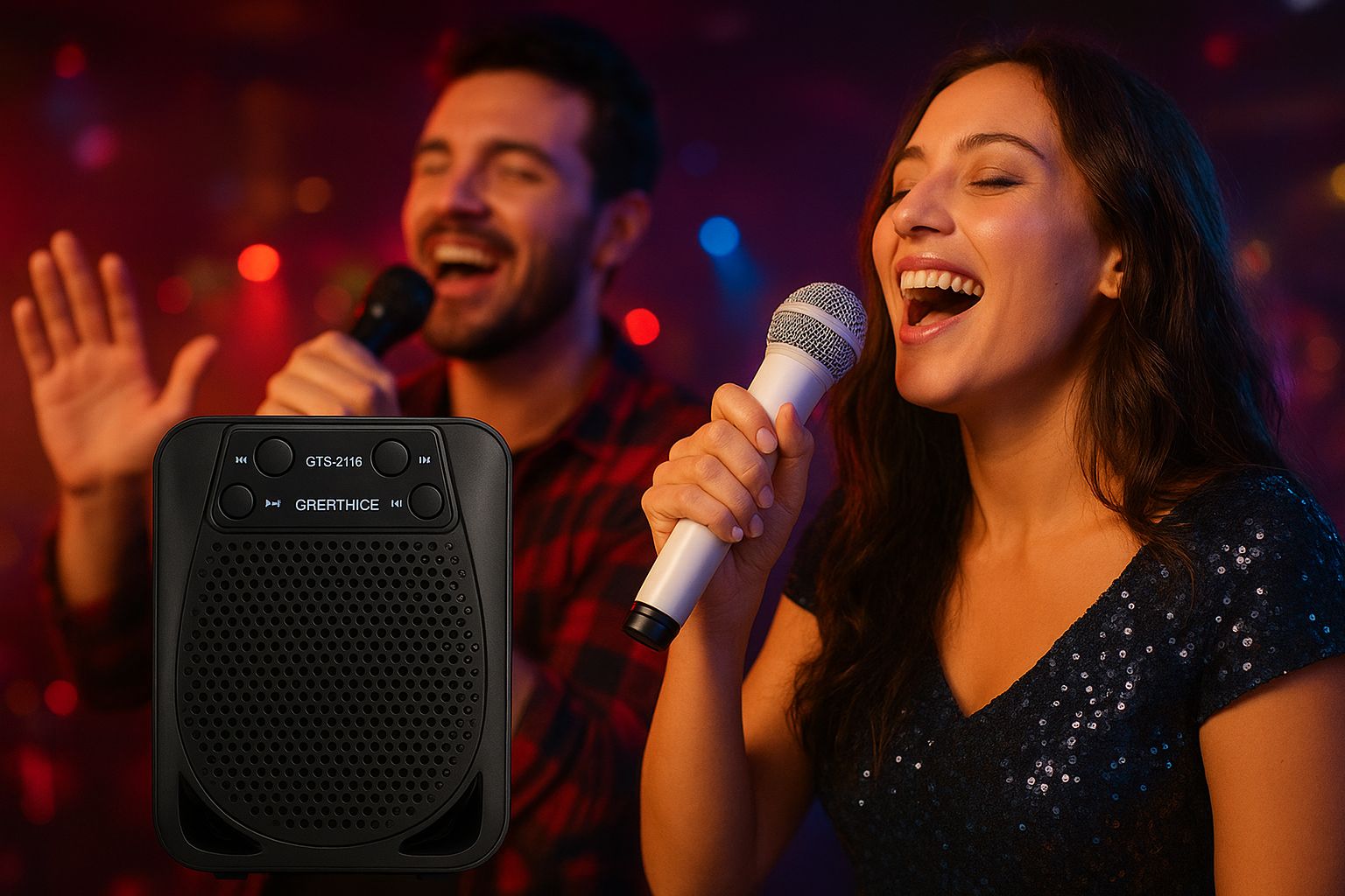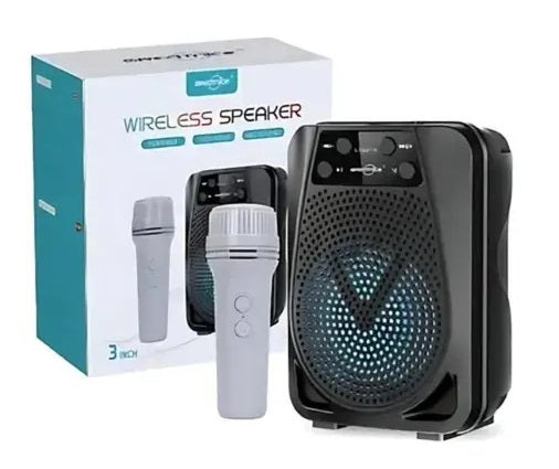 Parlante recargable con micrófono, bluetooth, conexión USB y radio. El micrófono modifica la voz con divertidos efectos.